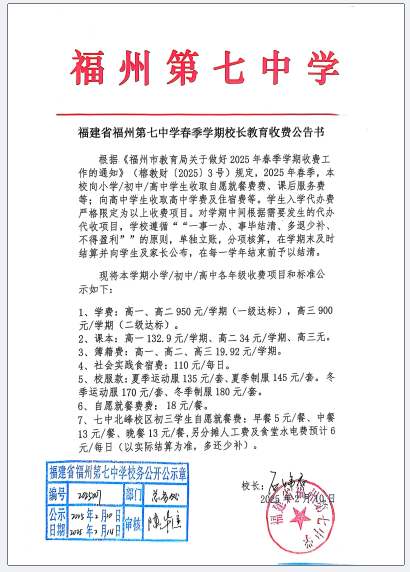 福建省福州第七中学春季学期校长教育收费公告书