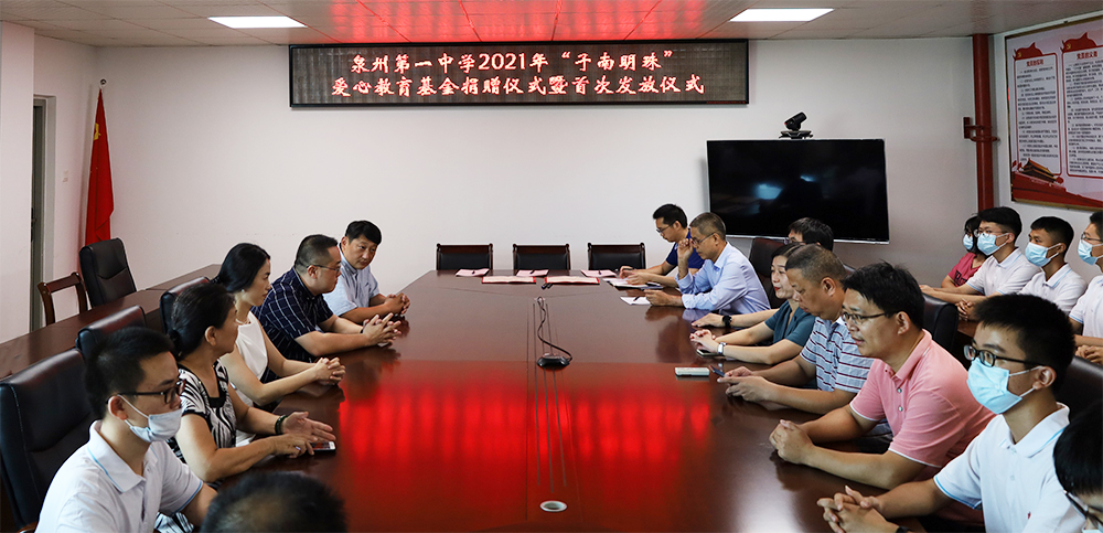 8月9日,新学年开学在即,泉州一中“子南明珠”爱心教育基金捐赠签约仪式暨首期颁发仪式在我校学府校区明治楼五楼会议室举行。许达川伉俪、党委书记潘奕峰、校长张海峰、副校长蔡景东、校党委副书记黄发森、副校长杨泉墩、校长助理杜石生、政教处主任陈胜贤、德育保卫处主任陈志伟、校友联络处主任李玲玲、原高三年段段长朱清华和洪国昌等老师参加颁发仪式。本次活动由蔡景东副校长主持。