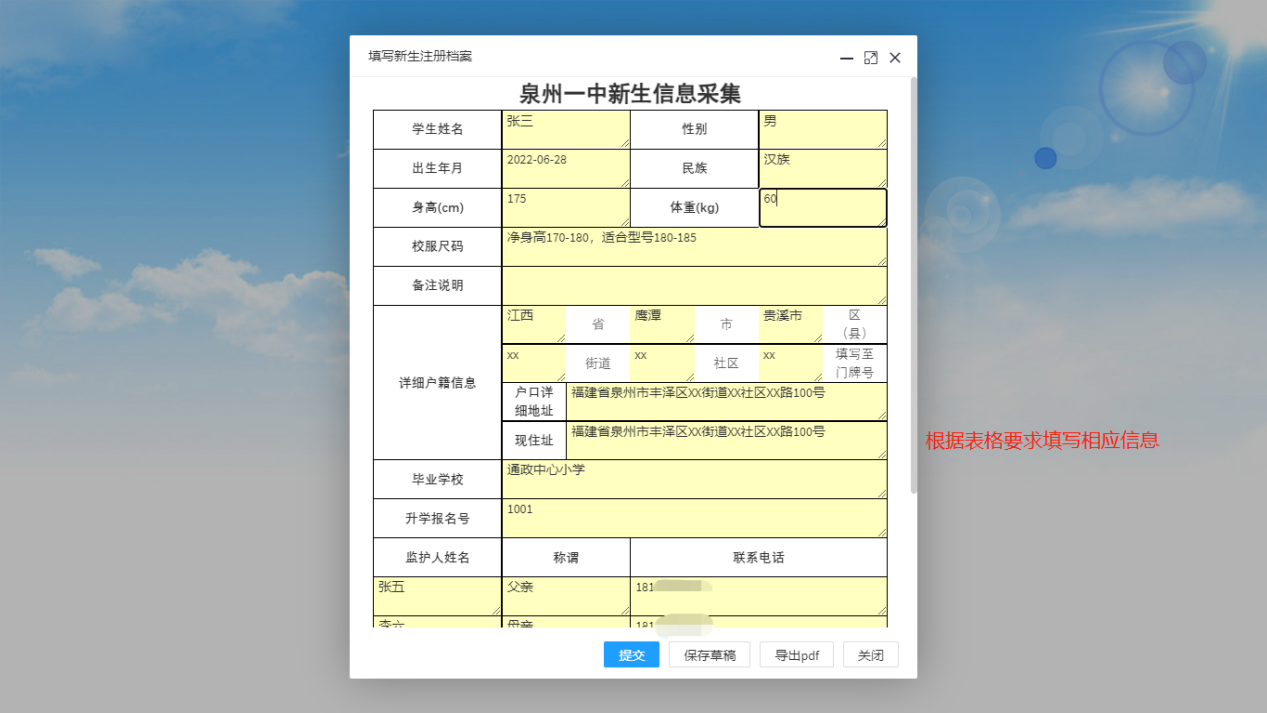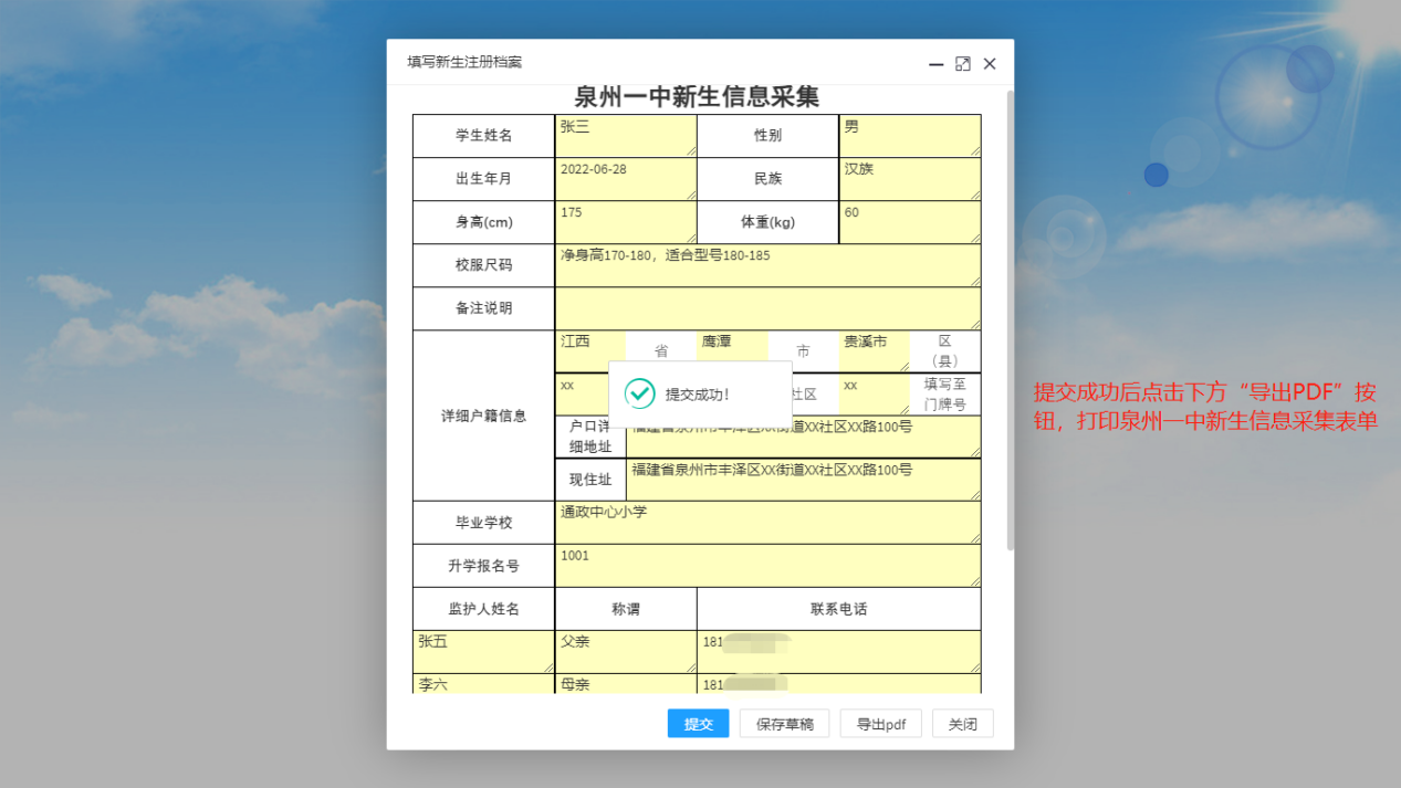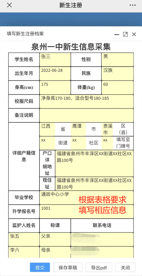 输入新生姓名和注册码(即为全国学籍号后八位,如有字母则统一用英文状态下的大写),点击【注册】(如图一),在弹窗表格中根据表单提示填入对应的信息并点击下方【提交】(如图二),提交成功后点击下方【导出PDF】打印“泉州一中新生信息采集表”(如图三)。