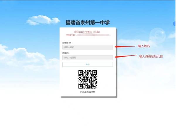 输入新生姓名和注册码(即为身份证号后八位或全国学籍号后八位,字母统一用大写,括号统一用英文版括号),点击【注册】(如图一),在弹窗表格中根据表单提示填入对应的信息并点击下方【提交】(如图二),提交成功后点击下方【导出PDF】打印“泉州一中初一新生信息采集表”(如图三)。