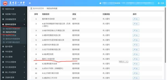 2. 点击右边菜单“教师业务档案”——“我的业务档案”中的 “教师三年规划表”填写。