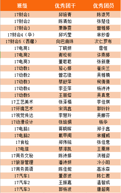 为表扬先进,树立典型,全面展示我校广大青年团员学生的优秀精神品格和价值追求,引导和激励全校所有团支部和团员、团干部在学校共青团事业中勇往直前、担当作为、开拓进取、无私奉献,积极发扬五四精神,为学校共青团事业改革发展贡献青春力量。经学校党总支及校团委会研究决定,对2017级会计3班团支部等10个“五四红旗先进团支部”、王婷芳等97名“优秀共青团员”、杨雅琼等86名“优秀共青团干部”予以表彰。