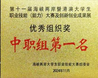 2024年11月10日,我校在第十一届海峡两岸暨港澳大学生职业技能(能力)大赛以及创新创业成果展中,共斩获10金8银7铜,获得了优秀组织奖中职组第一名的殊荣。