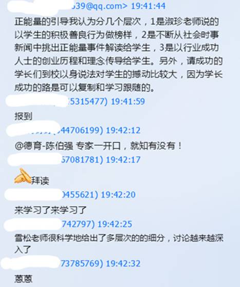 “如何传递课堂正能量”这个主题的关键一在于“何为正能量”,二在于“如何传递”。关于前者,老师们都给出了各自相应的定义:正能量既可以是大而化之的乐观向上、健康积极的人生态度,也可以是小到具体的一个善意的微笑,一双关注的目光,总之,无论是课堂还是社会,是个人还是集体,只要能使之和谐向上的力量都应该属于正能量,都应该弘扬和传递;关于后者,老师们也纷纷献计献策,比如“正面引导,正面评价学生“,“不把坏心情带入课堂”,“用老师自身的人格魅力感染学生”等等。另外,当聊到“拒绝负能量”的话题时,不少老师的方法也是让人脑洞大开,有的老师在被学生激怒后,便会去看一遍《康熙王朝》,发现皇帝活的更不容易,心里也就坦然了(以史为鉴);有的老师则是看一眼宝宝的照片身上便充满了正能量(中国好妈妈)……