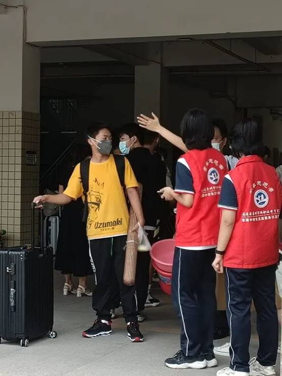 穿着红色马甲的志愿者们将迎新现场的秩序维持得井井有条,在忙碌的过程中还热情帮助有需要的新生提行李。而在校门口和南区女生宿舍门口也安排了部分志愿者负责测量体温、核验个人行程码、健康码以及三天两检核酸检测阴性证明等工作。